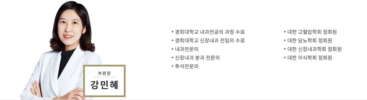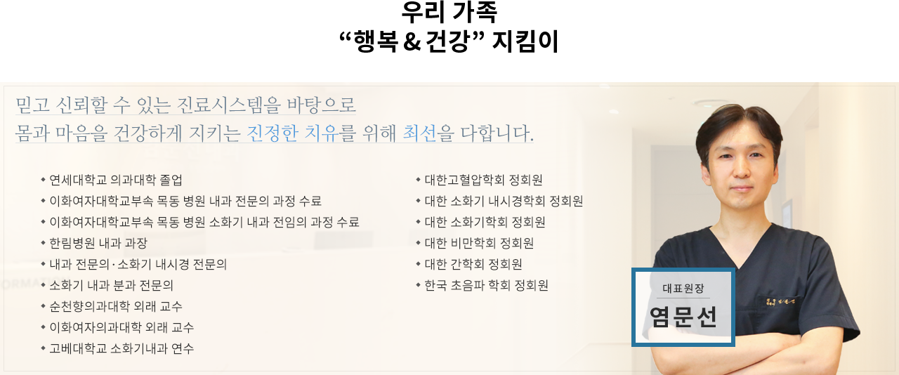 염문선 원장 약력 - 연세대학교 의과대학 졸업 - 이화여자대학교부속 목동 병원 내과 전문의 과정 수료 - 이화여자대학교부속 목동 병원 소화기 내과 전임의 과정 수료 - 한림병원 내과 과장 - 내과 전문의·소화기 내시경 전문의 - 순천향의과대학 외래 교수 - 이화여자의과대학 외래 교수 - 고베대학교 소화기내과 연수 - 대한고혈압학회 정회원 - 대한 소화기 내시경학회 정회원 - 대한 소화기학회 정회원 - 대한 비만학회 정회원 - 대한 간학회 정회원