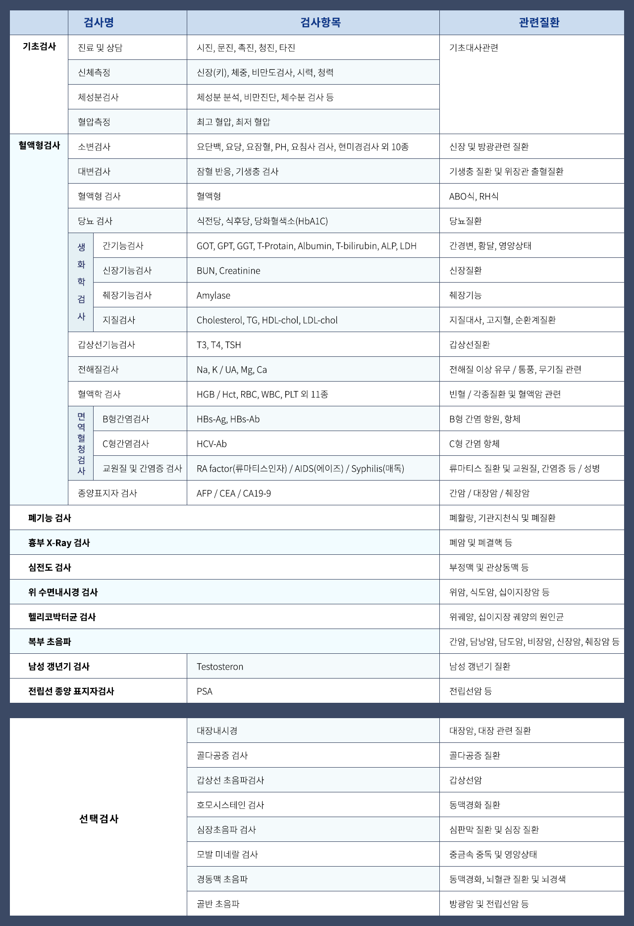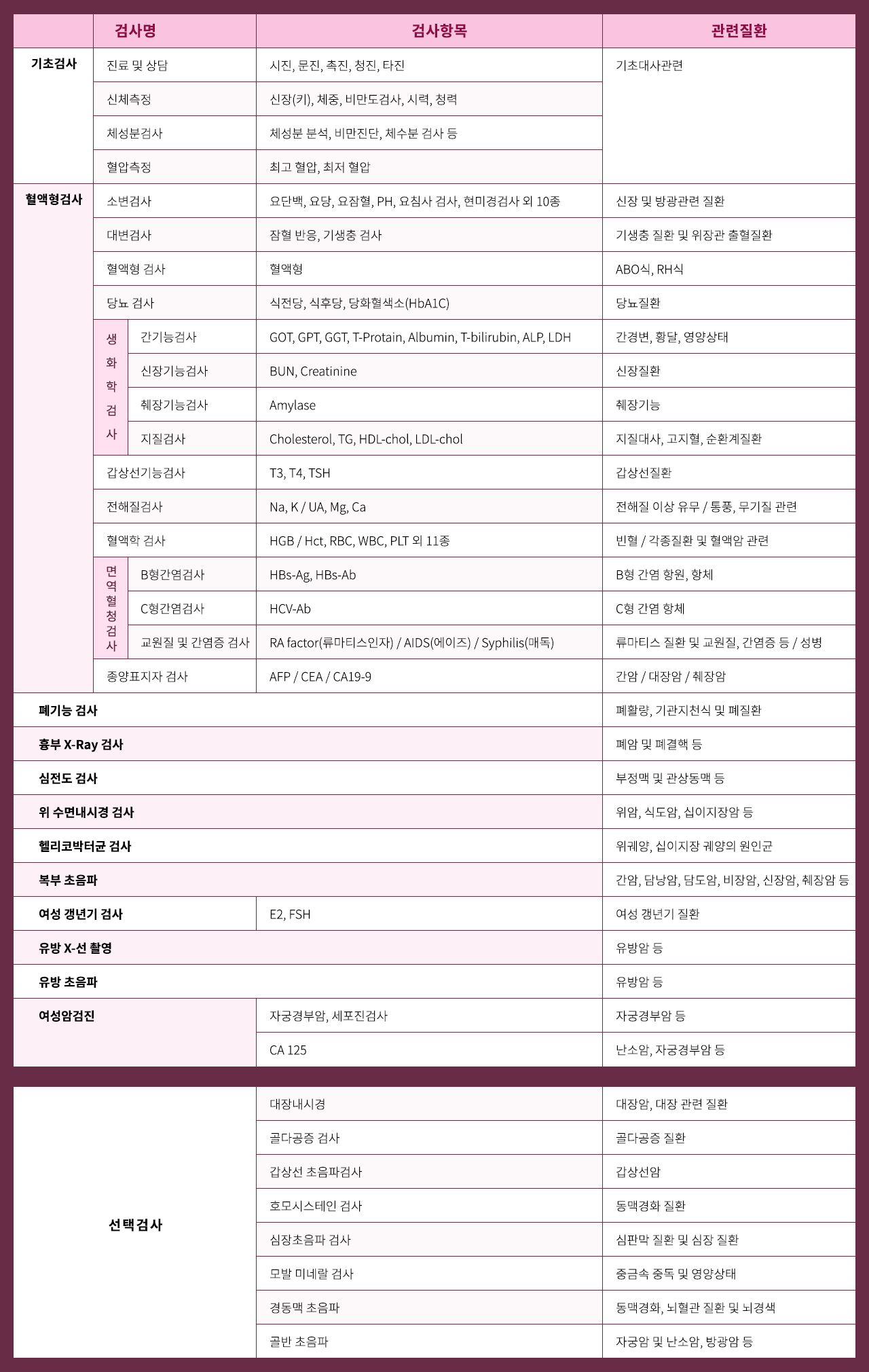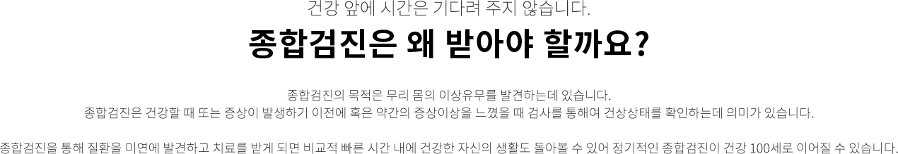 종합검진의 목적은 무리 몸의 이상유무를 발견하는데 있습니다. 종합검진은 건강할 때 또는 증상이 발생하기 이전에 혹은 약간의 증상이상을 느꼈을 때 검사를 통해여 건상상태를 확인하는데 의미가 있습니다. 종합검진을 통해 질환을 미연에 발견하고 치료를 받게 되면 비교적 빠른 시간 내에 건강한 자신의 생활도 돌아볼 수 있어 정기적인 종합검진이 건강 100세로 이어질 수 있습니다.
