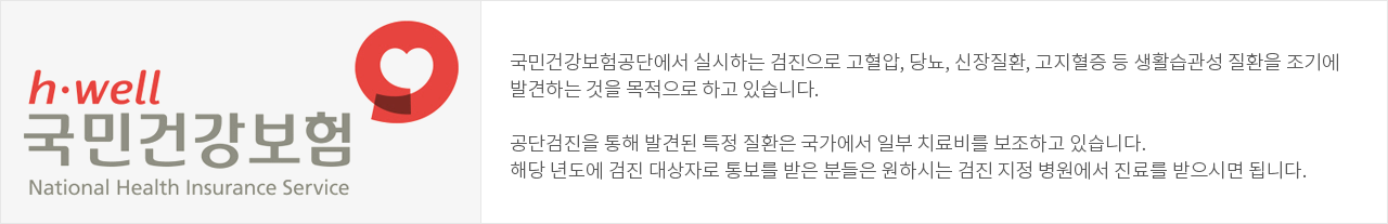 국민건강보험공단에서 실시하는 검진으로 고혈압, 당뇨, 신장질환, 고지혈증 등 생활습관성 질환을 조기에 발견하는 것을 목적으로 하고 있습니다. 공단검진을 통해 발견된 특정 질환은 국가에서 일부 치료비를 보조하고 있습니다. 해당 년도에 검진 대상자로 통보를 받은 분들은 원하시는 검진 지정 병원에서 진료를 받으시면 됩니다.