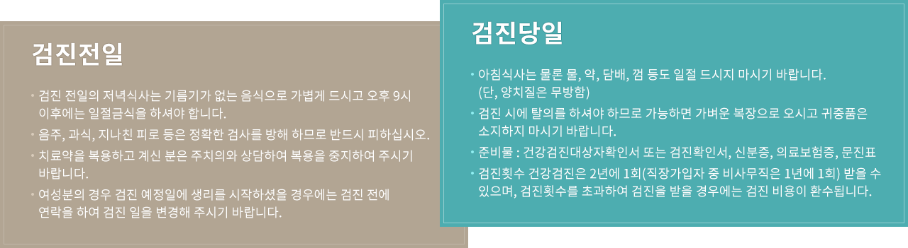 - 여성분의 경우 검진 예정일에 생리를 시작하셨을 경우에는 검진 전에 연락을 하여 검진 일을 변경해 주시기 바랍니다.