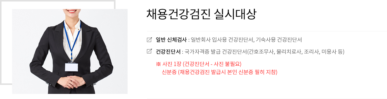 - 일반 신체검사 : 일반회사 입사용 건강진단서, 기숙사용 건강진단서 - 건강진단서 : 국가자격증 발급 건강진단서(간호조무사, 물리치료사, 조리사, 미용사 등) ※ 사진 1장 (건강진단서 - 사진 불필요) 신분증 (채용건강검진 발급시 본인 신분증 필히 지참)