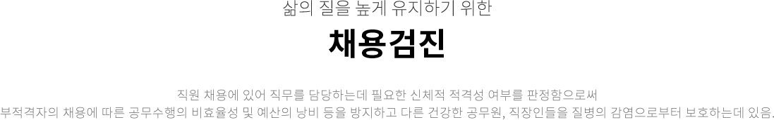 직원 채용에 있어 직무를 담당하는데 필요한 신체적 적격성 여부를 판정함으로써 부적격자의 채용에 따른 공무수행의 비효율성 및 예산의 낭비 등을 방지하고 다른 건강한 공무원, 직장인들을 질병의 감염으로부터 보호하는데 있음.