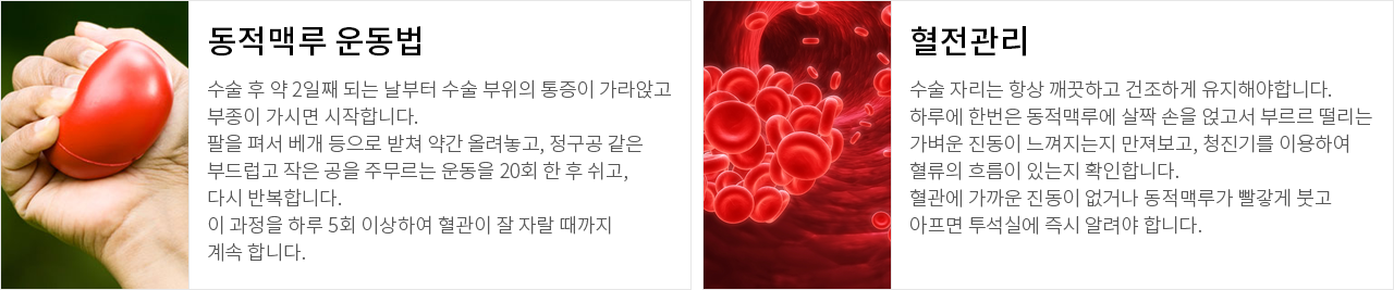 - 수술 후 약 2일째 되는 날부터 수술 부위의 통증이 가라앉고 부종이 가시면 시작합니다. 팔을 펴서 베개 등으로 받쳐 약간 올려놓고, 정구공 같은 부드럽고 작은 공을 주무르는 운동을 20회 한 후 쉬고, 다시 반복합니다. 이 과정을 하루 5회 이상하여 혈관이 잘 자랄 때까지 계속 합니다.