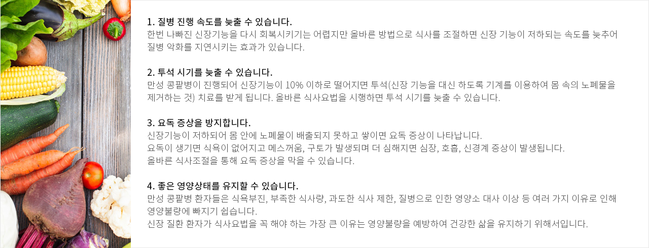 만성 콩팥병 환자들은 식욕부진, 부족한 식사량, 과도한 식사 제한, 질병으로 인한 영양소 대사 이상 등 여러 가지 이유로 인해 영양불량에 빠지기 쉽습니다. 신장 질환 환자가 식사요법을 꼭 해야 하는 가장 큰 이유는 영양불량을 예방하여 건강한 삶을 유지하기 위해서입니다.