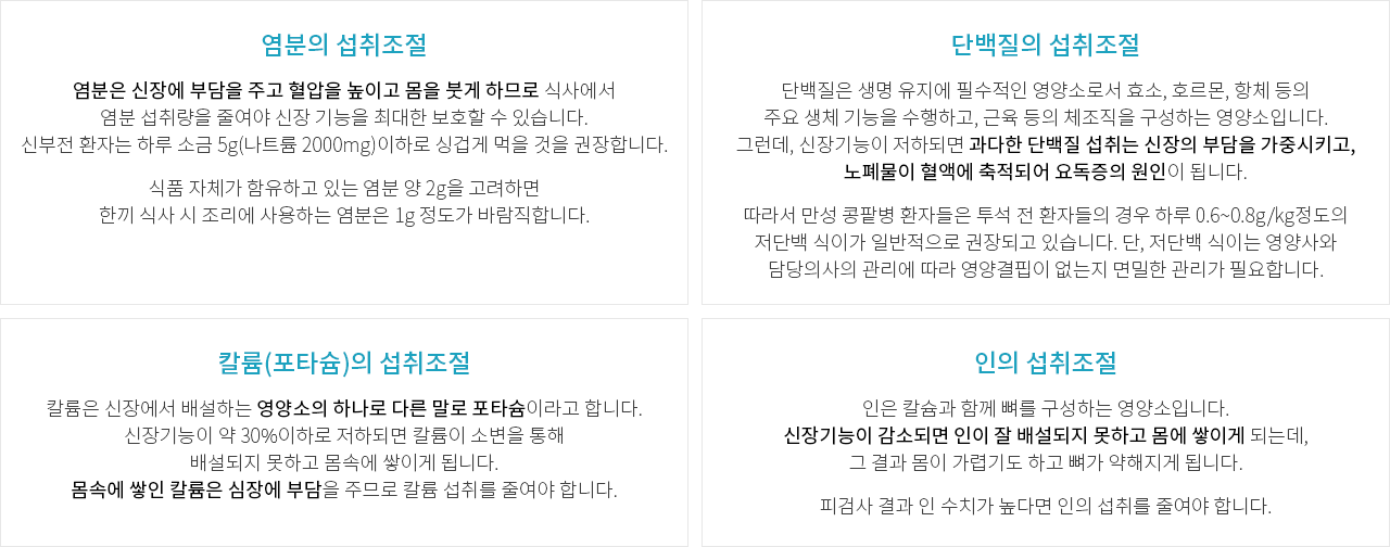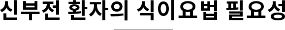 한번 나빠진 신장기능을 다시 회복시키기는 어렵지만 올바른 방법으로 식사를 조절하면 신장 기능이 저하되는 속도를 늦추어 질병 악화를 지연시키는 효과가 있습니다.