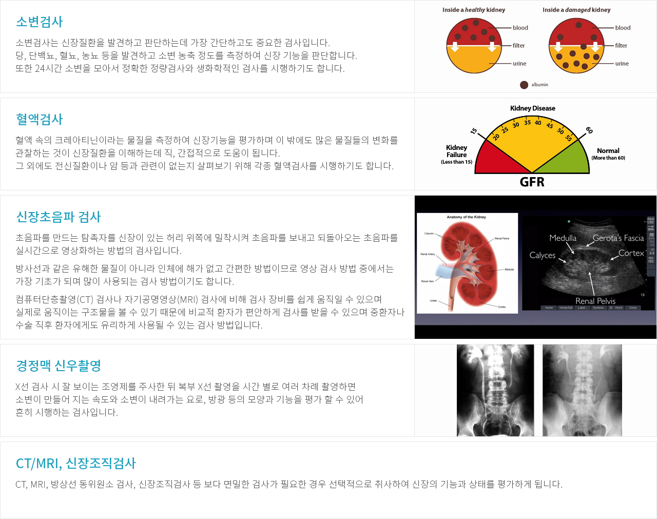 - CT, MRI, 방상선 동위원소 검사, 신장조직검사 등 보다 면밀한 검사가 필요한 경우 선택적으로 취사하여 신장의 기능과 상태를 평가하게 됩니다.