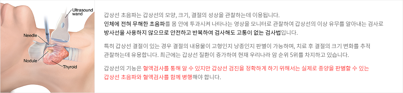 갑상선의 기능은 혈액검사를 통해 알 수 있지만 갑상선 검진을 정확하게 하기 위해서는 실제로 종양을 판별할 수 있는 갑상선 초음파와 혈액검사를 함께 병행해야 합니다.