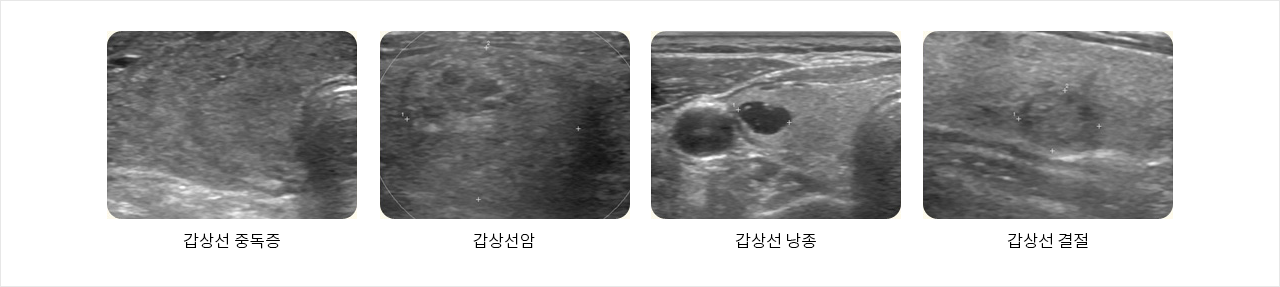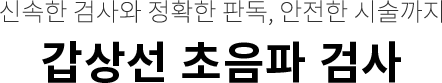갑상선 초음파는 갑상선의 모양, 크기, 결절의 성상을 관찰하는데 이용됩니다. 인체에 전혀 무해한 초음파를 몸 안에 투과시켜 나타나는 영상을 모니터로 관찰하여 갑상선의 이상 유무를 알아내는 검사로 방사선을 사용하지 않으므로 안전하고 반복하여 검사해도 고통이 없는 검사법입니다.