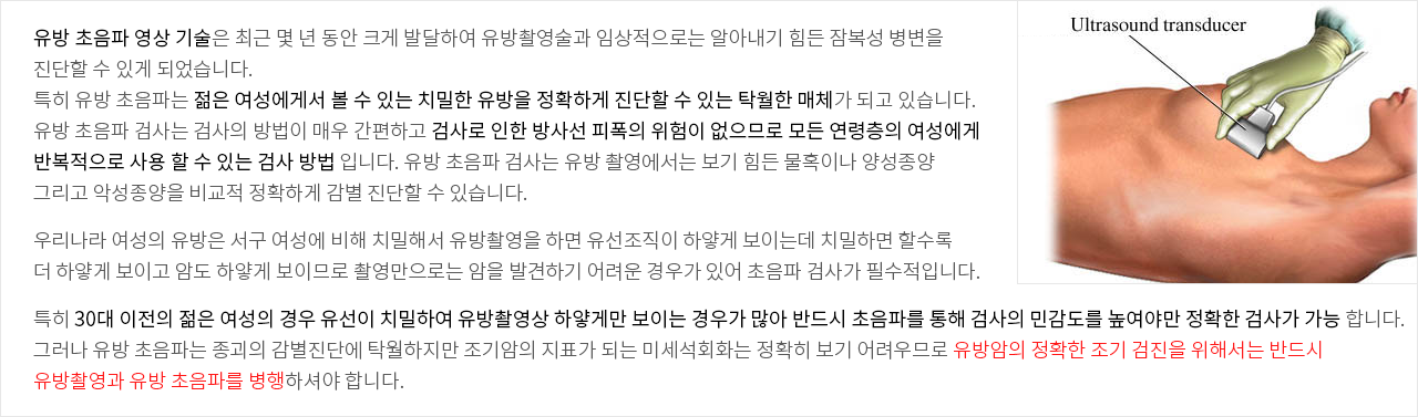 유방 초음파 영상 기술은 최근 몇 년 동안 크게 발달하여 유방촬영술과 임상적으로는 알아내기 힘든 잠복성 병변을 진단할 수 있게 되었습니다. 특히 유방 초음파는 젊은 여성에게서 볼 수 있는 치밀한 유방을 정확하게 진단할 수 있는 탁월한 매체가 되고 있습니다. 유방 초음파 검사는 검사의 방법이 매우 간편하고 검사로 인한 방사선 피폭의 위험이 없으므로 모든 연령층의 여성에게 반복적으로 사용 할 수 있는 검사 방법 입니다. 유방 초음파 검사는 유방 촬영에서는 보기 힘든 물혹이나 양성종양 그리고 악성종양을 비교적 정확하게 감별 진단할 수 있습니다.