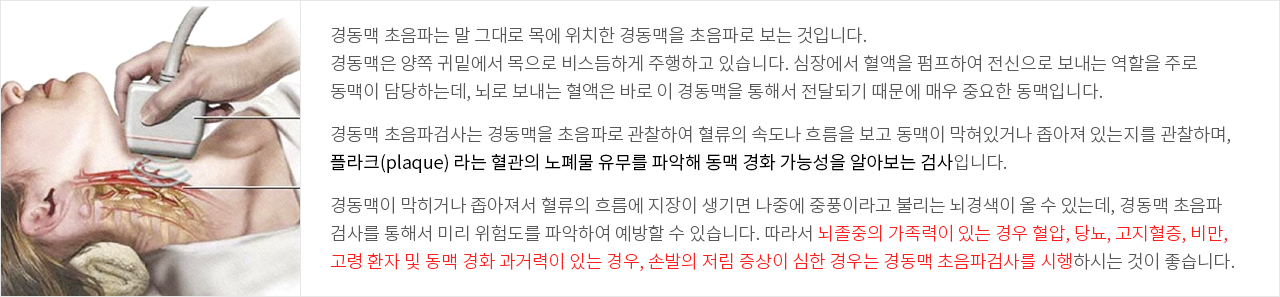 경동맥 초음파검사는 경동맥을 초음파로 관찰하여 혈류의 속도나 흐름을 보고 동맥이 막혀있거나 좁아져 있는지를 관찰하며, 플라크(plaque) 라는 혈관의 노폐물 유무를 파악해 동맥 경화 가능성을 알아보는 검사입니다.
