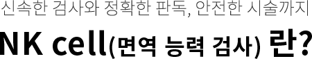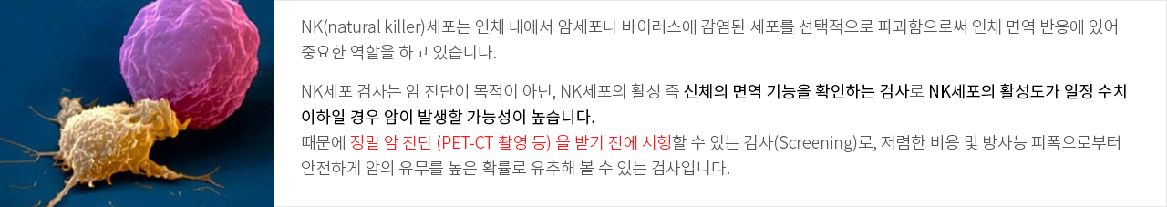 NK세포 검사는 암 진단이 목적이 아닌, NK세포의 활성 즉 신체의 면역 기능을 확인하는 검사로 NK세포의 활성도가 일정 수치 이하일 경우 암이 발생할 가능성이 높습니다. 때문에 정밀 암 진단 (PET-CT 촬영 등) 을 받기 전에 시행할 수 있는 검사(Screening)로, 저렴한 비용 및 방사능 피폭으로부터 안전하게 암의 유무를 높은 확률로 유추해 볼 수 있는 검사입니다.