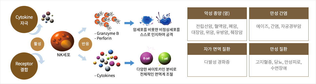 NK(natural killer)세포는 인체 내에서 암세포나 바이러스에 감염된 세포를 선택적으로 파괴함으로써 인체 면역 반응에 있어 중요한 역할을 하고 있습니다.