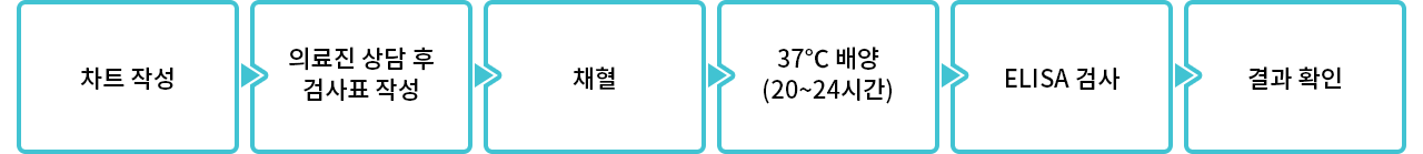 차트 작성 → 의료진 상담 후 검사표 작성 → 채혈 → 37℃ 배양 (20~24시간) → ELISA 검사 → 결과 확인
