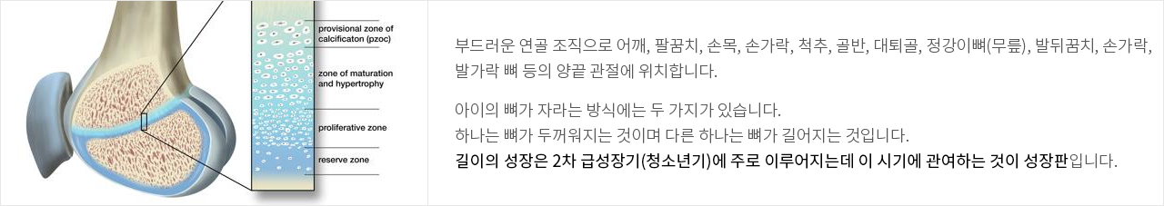 아이의 뼈가 자라는 방식에는 두 가지가 있습니다. 하나는 뼈가 두꺼워지는 것이며 다른 하나는 뼈가 길어지는 것입니다. 길이의 성장은 2차 급성장기(청소년기)에 주로 이루어지는데 이 시기에 관여하는 것이 성장판입니다.