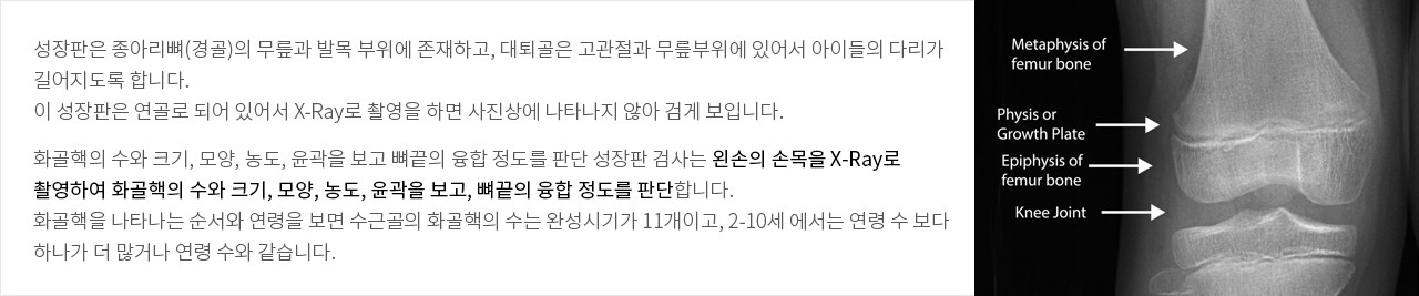 성장판은 종아리뼈(경골)의 무릎과 발목 부위에 존재하고, 대퇴골은 고관절과 무릎부위에 있어서 아이들의 다리가 길어지도록 합니다. 이 성장판은 연골로 되어 있어서 X-Ray로 촬영을 하면 사진상에 나타나지 않아 검게 보입니다.