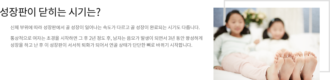 신체 부위에 따라 성장판에서 골 성장이 일어나는 속도가 다르고 골 성장이 완료되는 시기도 다릅니다.