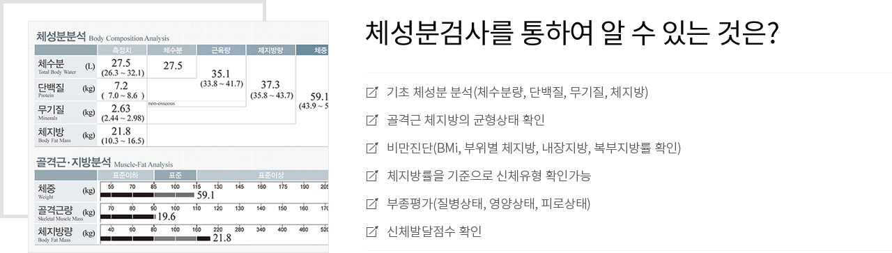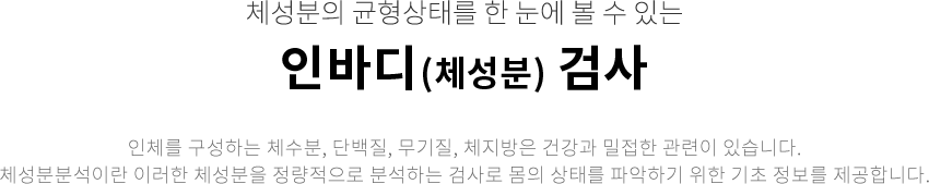 인체를 구성하는 체수분, 단백질, 무기질, 체지방은 건강과 밀접한 관련이 있습니다. 체성분분석이란 이러한 체성분을 정량적으로 분석하는 검사로 몸의 상태를 파악하기 위한 기초 정보를 제공합니다.