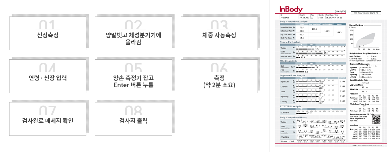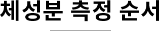 신장측정 → 양말벗고 체성분기기에 올라감 → 체중 자동측정 → 연령 . 신장 입력 → 양손 측정기 잡고 Enter 버튼 누름 → 측정 (약 2분 소요) → 검사완료 메세지 확인 → 검사지 출력