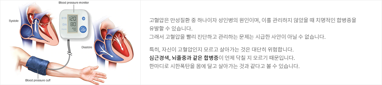 특히, 자신이 고혈압인지 모르고 살아가는 것은 대단히 위험합니다. 심근경색, 뇌졸중과 같은 합병증이 언제 닥칠 지 모르기 때문입니다. 한마디로 시한폭탄을 몸에 달고 살아가는 것과 같다고 볼 수 있습니다.