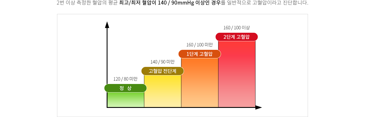 2번 이상 측정한 혈압의 평균 최고/최저 혈압이 140 / 90mmHg 이상인 경우를 일반적으로 고혈압이라고 진단합니다.