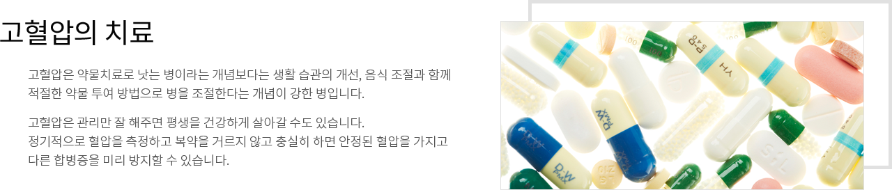 고혈압은 약물치료로 낫는 병이라는 개념보다는 생활 습관의 개선, 음식 조절과 함께 적절한 약물 투여 방법으로 병을 조절한다는 개념이 강한 병입니다.