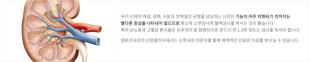 우리 신체의 배설, 정화, 수분과 전해질의 균형을 담당하는 신장은 기능이 아주 악화되기 전까지는 별다른 증상을 나타내지 않으므로 평소에 소변검사와 혈액검사를 하시는 것이 좋습니다. 특히 당뇨병과 고혈압 환자들은 신부전이 잘 합병되므로 반드시 연 1-2회 정도는 검사를 하셔야 합니다.