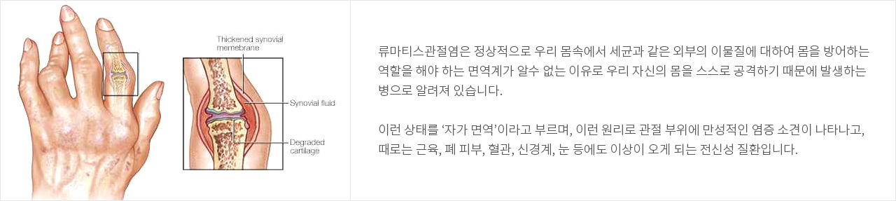 류마티스관절염은 정상적으로 우리 몸속에서 세균과 같은 외부의 이물질에 대하여 몸을 방어하는 역할을 해야 하는 면역계가 알수 없는 이유로 우리 자신의 몸을 스스로 공격하기 때문에 발생하는 병으로 알려져 있습니다.
