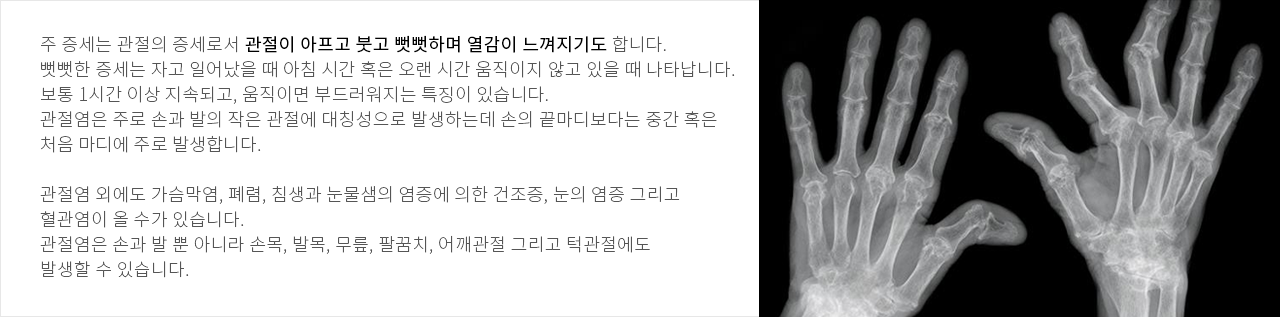 이런 상태를 ‘자가 면역’이라고 부르며, 이런 원리로 관절 부위에 만성적인 염증 소견이 나타나고, 때로는 근육, 폐 피부, 혈관, 신경계, 눈 등에도 이상이 오게 되는 전신성 질환입니다.