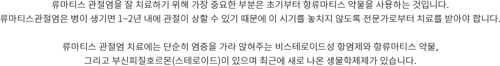 류마티스 관절염을 잘 치료하기 위해 가장 중요한 부분은 초기부터 항류마티스 약물을 사용하는 것입니다. 류마티스관절염은 병이 생기면 1~2년 내에 관절이 상할 수 있기 때문에 이 시기를 놓치지 않도록 전문가로부터 치료를 받아야 합니다.