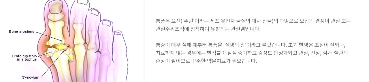 통풍은 요산(‘퓨린’이라는 세포 유전자 물질의 대사 신물)의 과잉으로 요산의 결정이 관절 또는 관절주위조직에 침착하여 유발되는 관절염입니다.