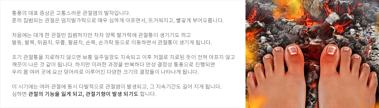 통증이 매우 심해 예부터 통풍을 ‘질병의 왕’이라고 불렀습니다. 초기 발병은 조절이 잘되나, 치료하지 않는 경우에는 발작률이 점점 증가하고 증상도 만성화되고 관절, 신장, 심-뇌혈관의 손상이 쌓이므로 꾸준한 약물치료가 필요합니다.