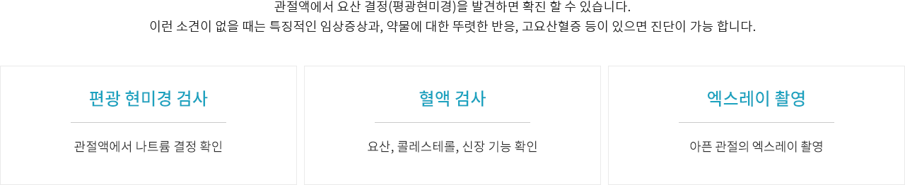 관절액에서 요산 결정(평광 현미경)을 발견하면 확진 할 수 있습니다. 이런 소견이 없을 때는 특징적인 임상증상과, 약물에 대한 뚜렷한 반응, 고요산혈증 등이 있으면 진단이 가능 합니다.