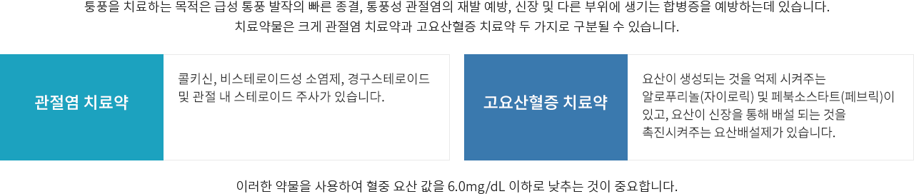 퉁풍을 치료하는 목적은 급성 통풍 발작의 빠른 종결, 통풍성 관절염의 재발 예방, 신장 및 다른 부위에 생기는 합병증을 예방하는데 있습니다. 치료약물은 크게 관절염 치료약과 고요산혈증 치료약 두 가지로 구분될 수 있습니다.