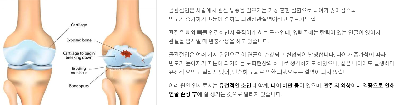골관절염은 여러 가지 원인으로 이 연골이 손상되고 변성되어 발생합니다. 나이가 증가함에 따라 빈도가 높아지기 때문에 과거에는 노화현상의 하나로 생각하기도 하였으나, 젊은 나이에도 발생하며 유전적 요인도 알려져 있어, 단순히 노화로 인한 퇴행으로는 설명이 되지 않습니다.