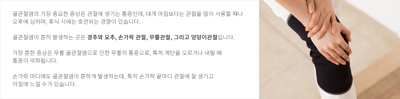 골관절염의 가장 중요한 증상은 관절에 생기는 통증인데, 대개 아침보다는 관절을 많이 사용할 때나 오후에 심하며, 휴식 시에는 호전되는 경향이 있습니다.