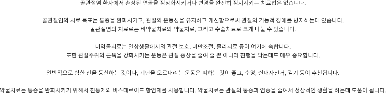 골관절염의 치료 목표는 통증을 완화시키고, 관절의 운동성을 유지하고 개선함으로써 관절의 기능적 장애를 방지하는데 있습니다. 골관절염의 치료로는 비약물치료와 약물치료, 그리고 수술치료로 크게 나눌 수 있습니다.